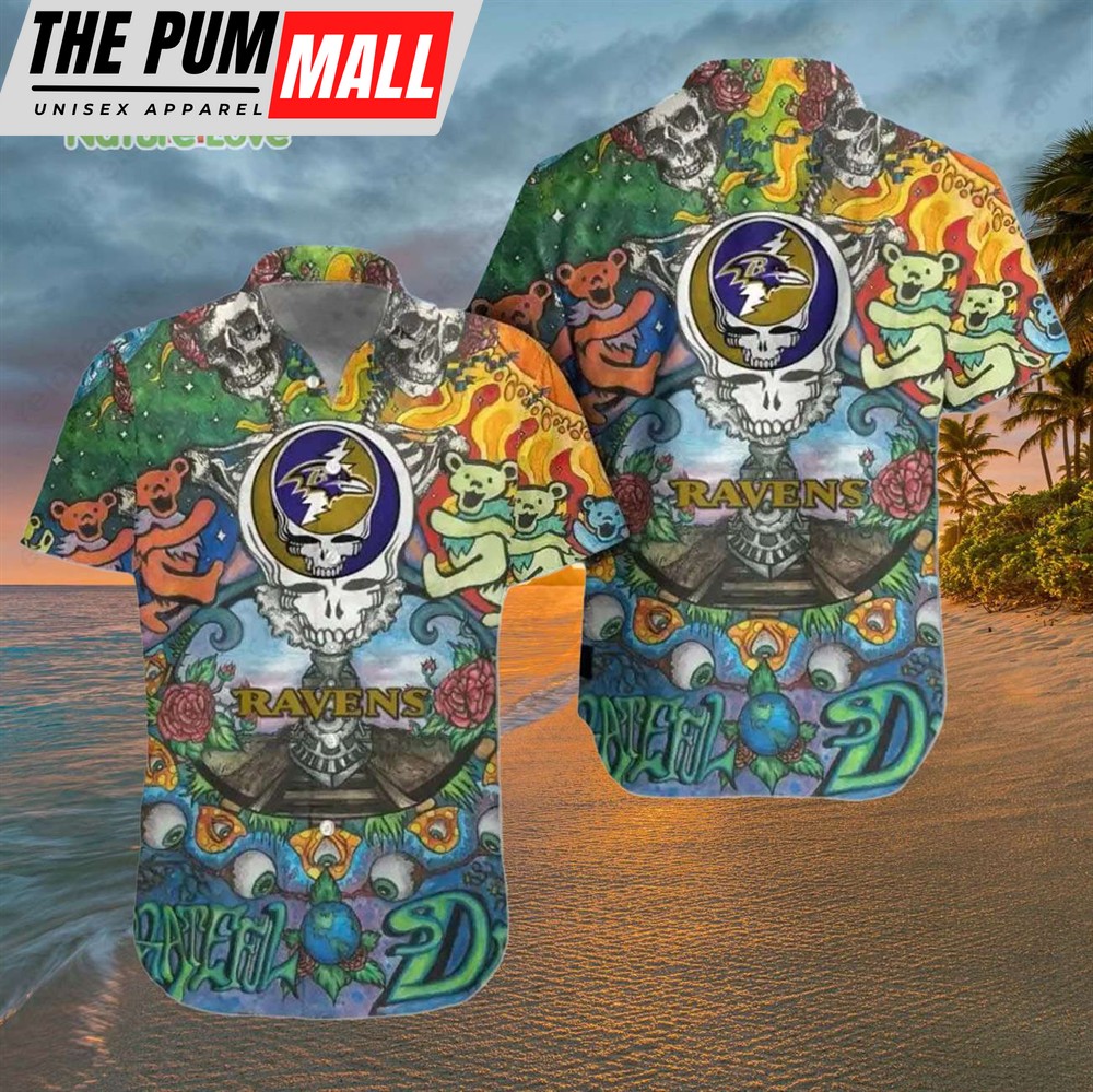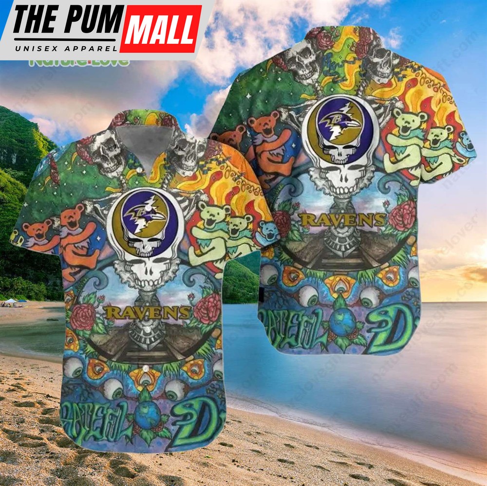 Baltimore Ravens Grateful Dead Skull and Roses NFL Hawaiian Shirt