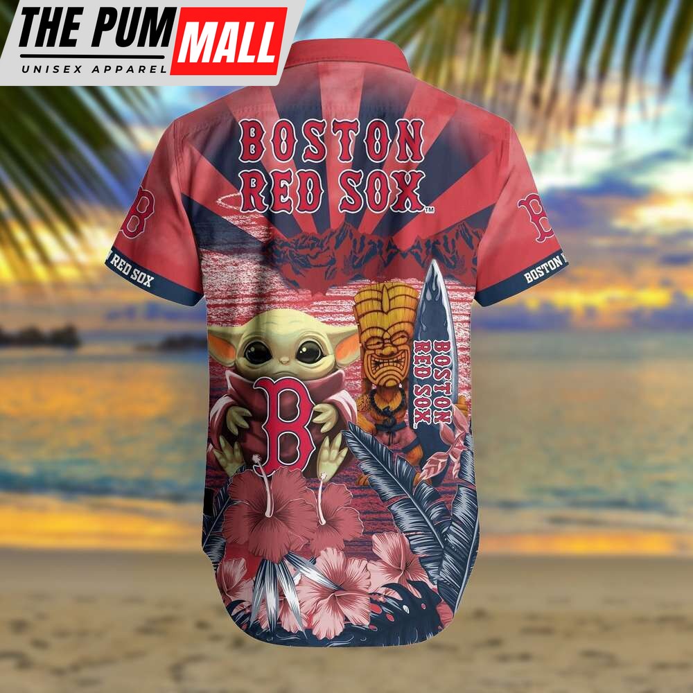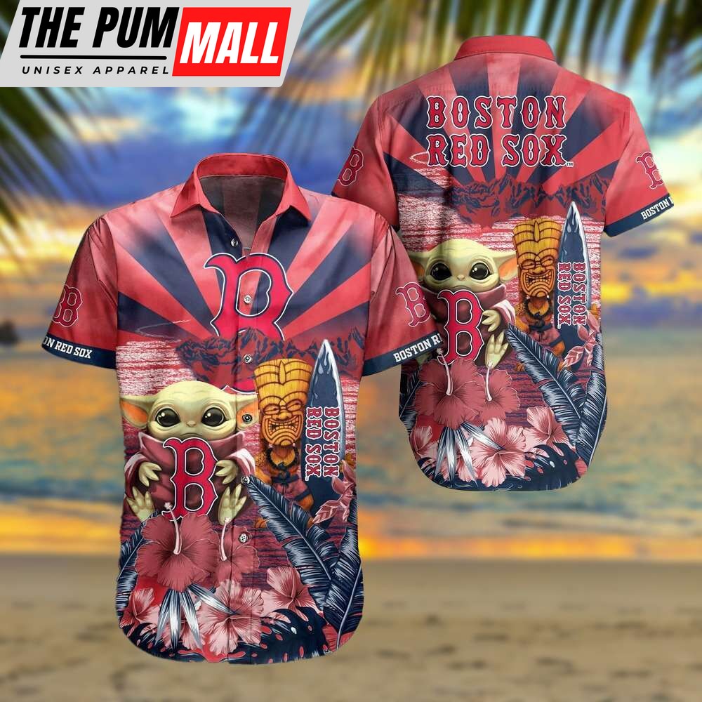Boston Red Sox Baby Yoda Red Hibiscus Hawaiian Shirt