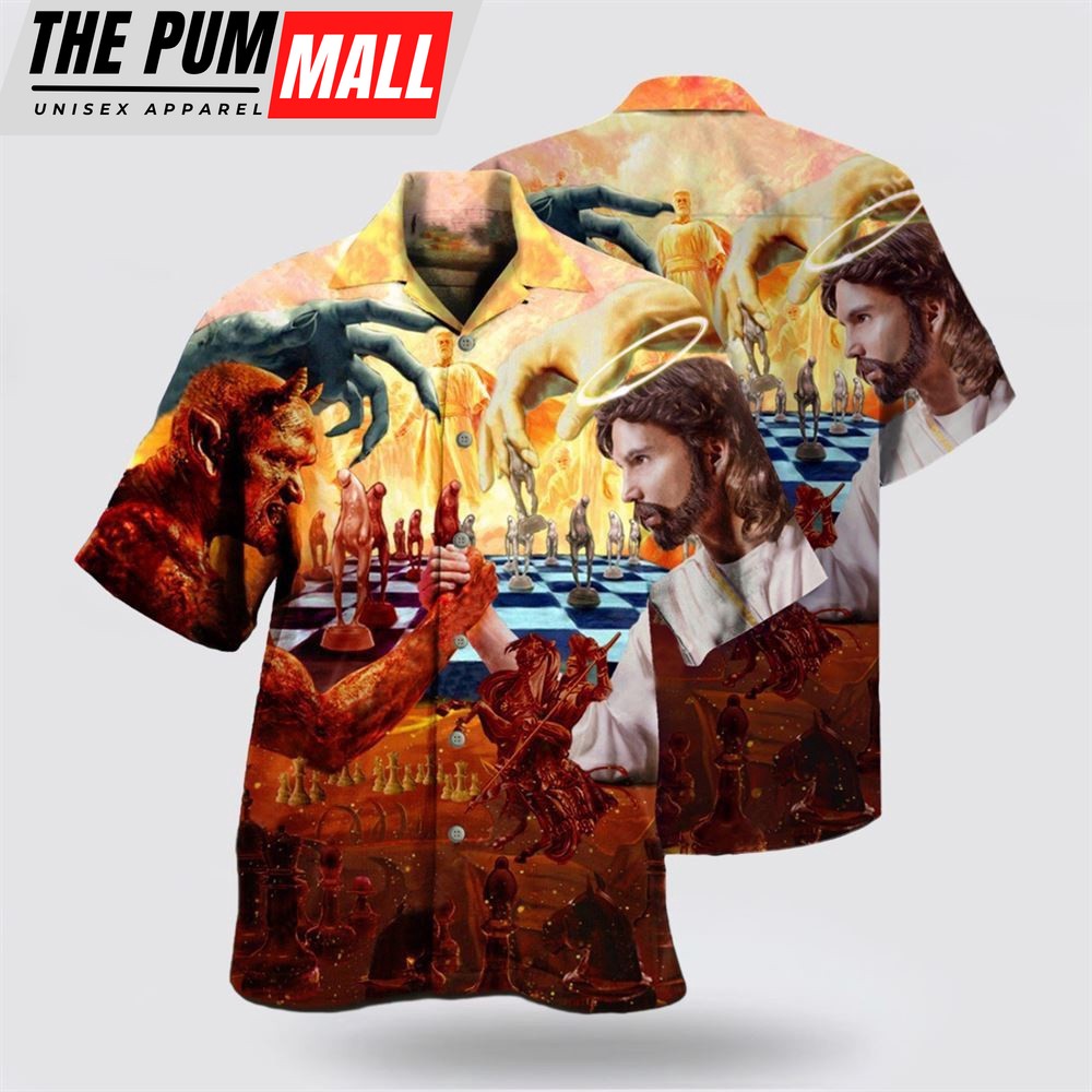 Christian Hawaiian Shirt, Chess Battle Satan Jesus Cool Style Hawaiian Shirt, Religion Hawaiian Shirt