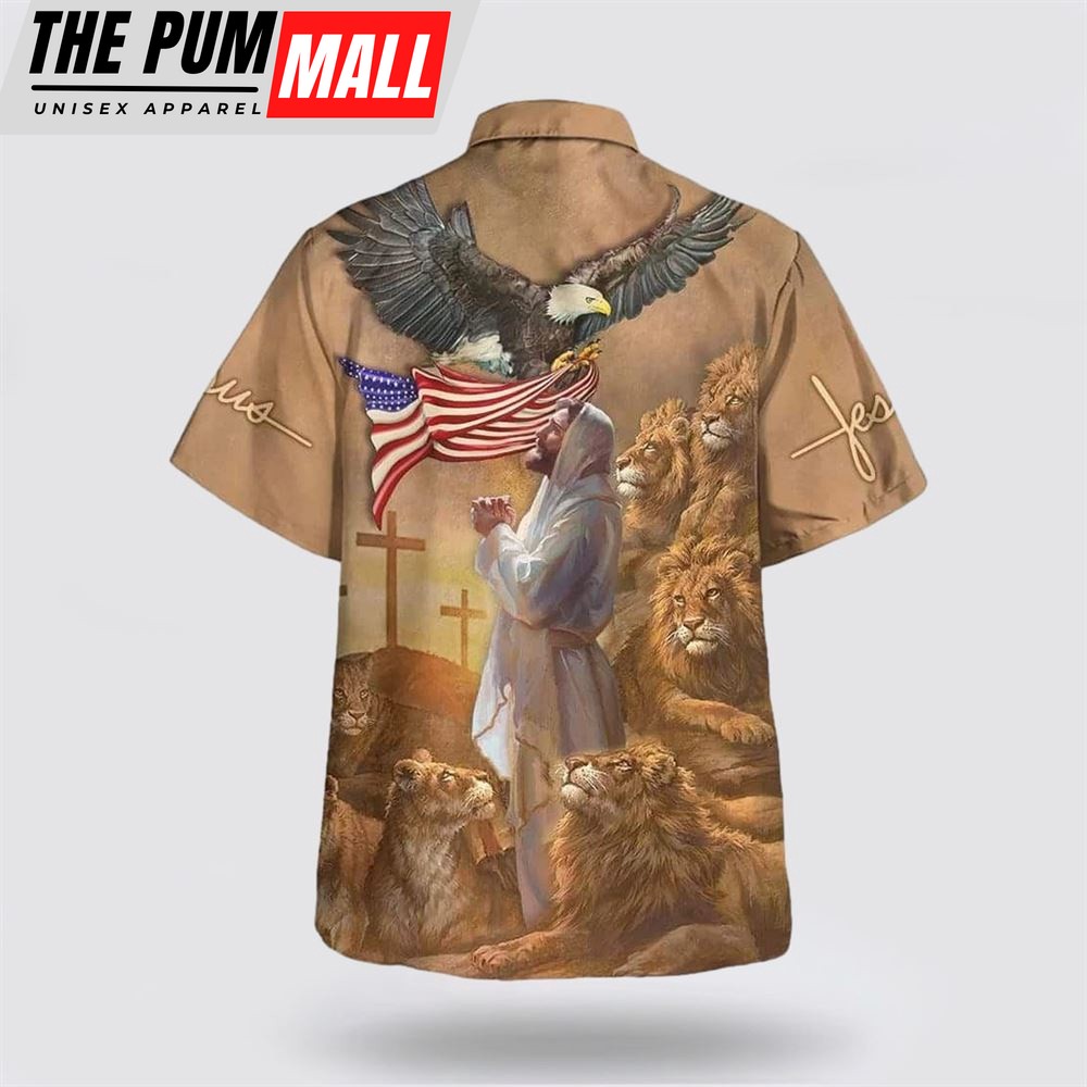Christian Hawaiian Shirt, US Flag Jesus Pray Lion Cross Christian, Christian Clothing Hawaii