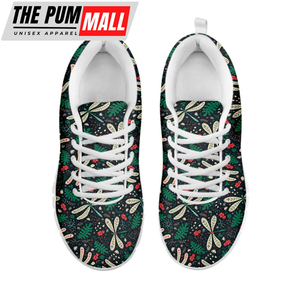 Christmas Floral Dragonfly Pattern Print White Running Shoes, Gift For Men And Women