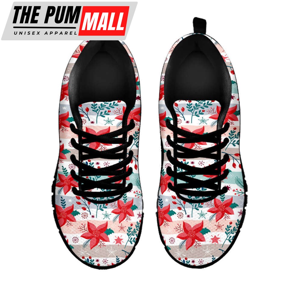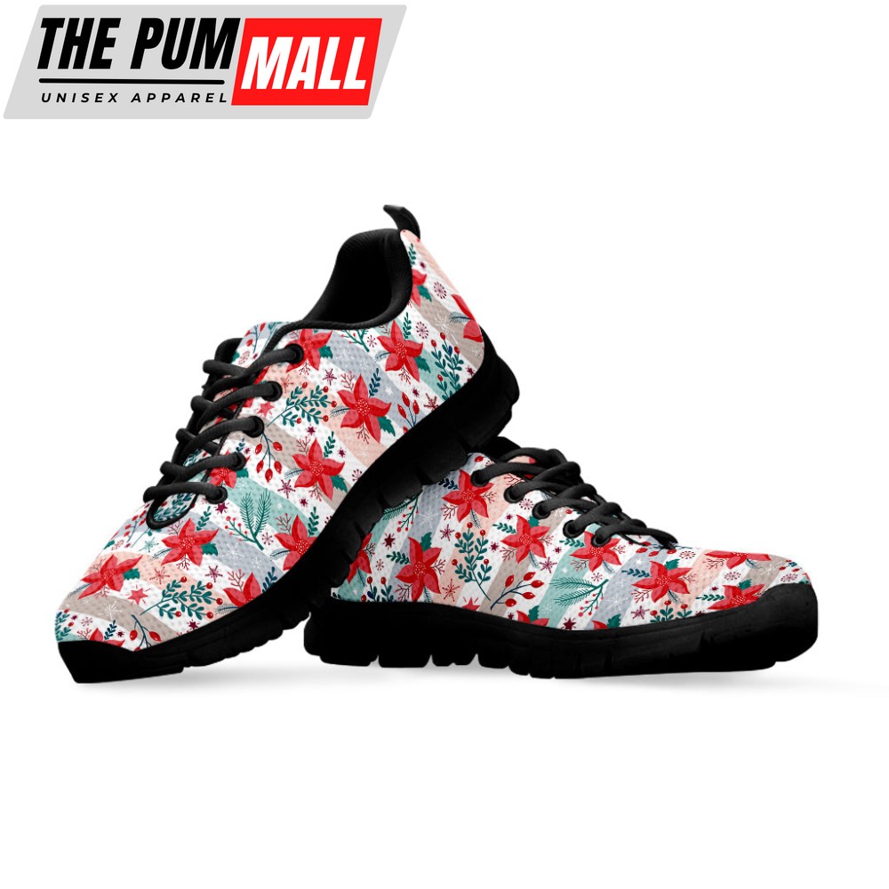 Cute Christmas Poinsettia Pattern Print Black Running Shoes, Gift For Men And Women