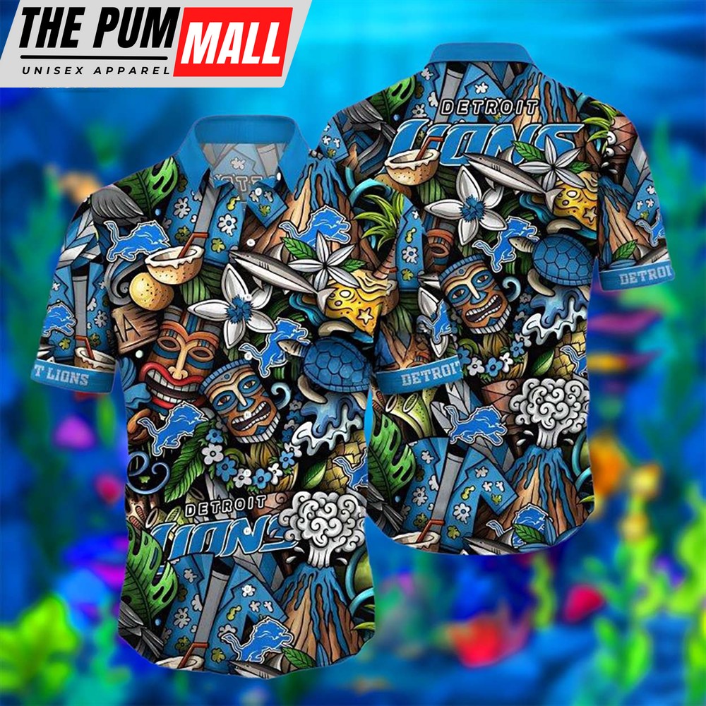 Detroit Lions Tiki Icons Blue Hawaiian Button Up Shirt