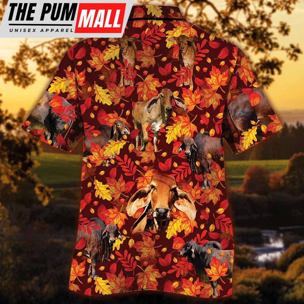 Farm Hawaiian Shirt, Red Brahman Cattle Autumn Leaves All Over Printed 3D Hawaiian Shirt, Animal Hawaiian Shirt