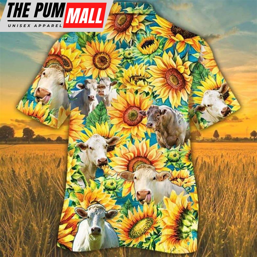 Farm Hawaiian Shirt, Sunflower Charolais Cattle All Printed 3D Hawaiian Shirt, Animal Hawaiian Shirt