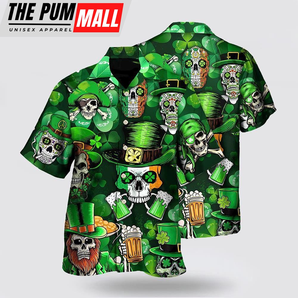 Irish Skull St Patrick’s Day Green Light Hawaiian Shirt, St Patricks Day Shirts, Shamrock Hawaiian Shirt