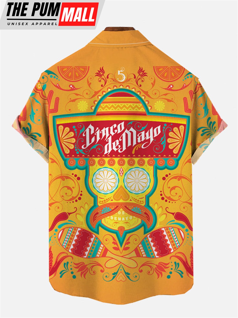 Mexican Hawaiian Shirt, Casual Yellow Cinco De Mayo Exotic Mexican Style Skull Hawaiian Shirt