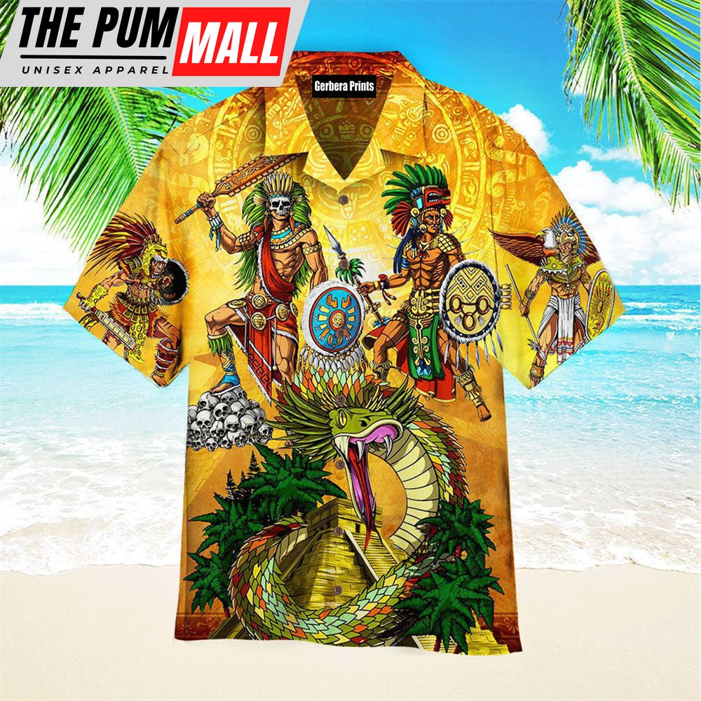 Mexican Hawaiian Shirt, Mexican Aztec Tribe Warrior Yellow Hawaiian Shirt