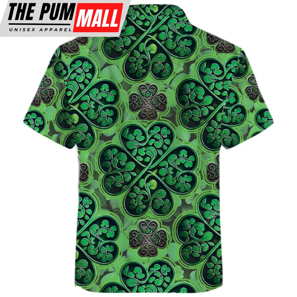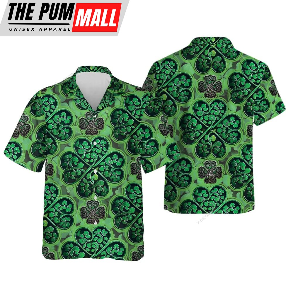 St Patricks Day Hawaiian Shirt, Four-leaf Clover Printed Hawaiian Shirts For Men, Lucky Shamrock Leaves Pattern Men’s Hawaiian Button Down Shirt