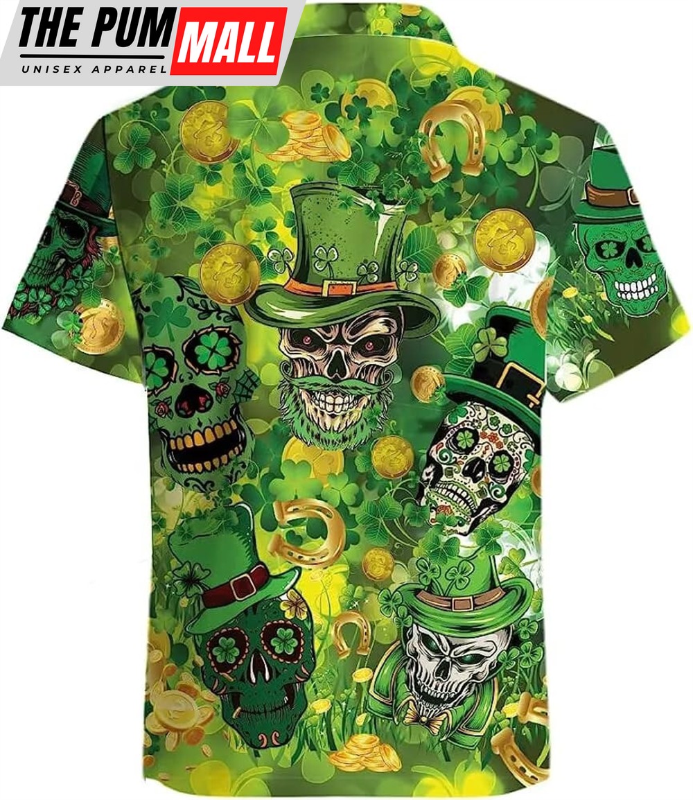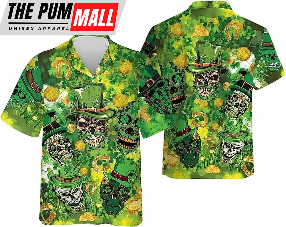 St Patricks Day Hawaiian Shirt, Green Skulls And Clover Pattern Hawaiian Shirt, St. Patrick’s Day Shirt