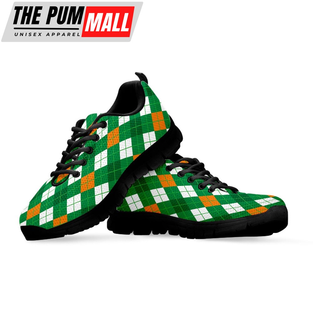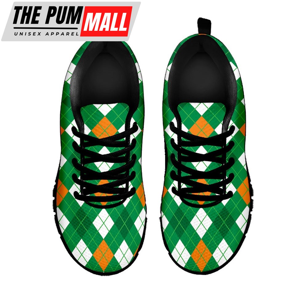 St Patrick’s Day Shoes, Saint Patrick’s Day Argyle Pattern Print Black Running Shoes, St Patrick’s Day Sneakers