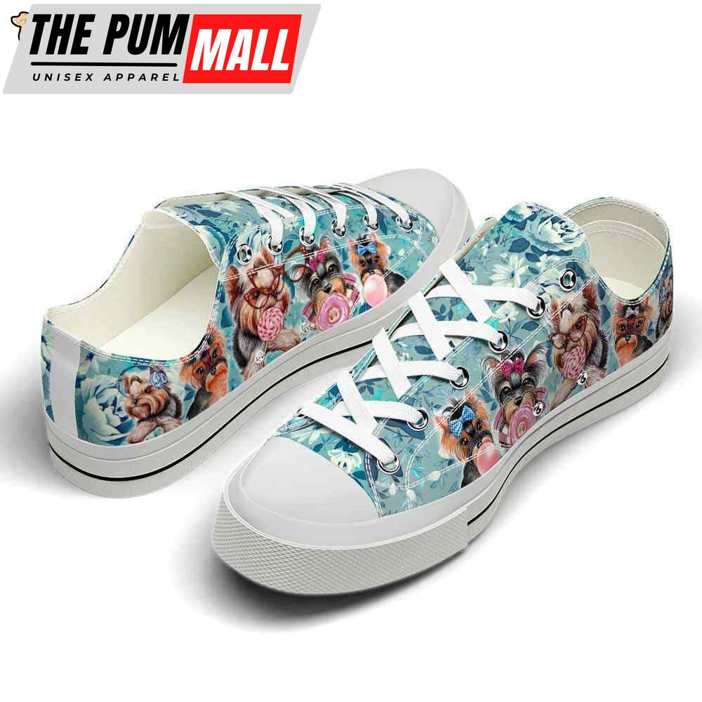 Yorkshire Terrier Blue Flowers Candy Low Top Shoes – Happy International Dog Day Canvas Sneaker – Owners Gift Dog Breeders